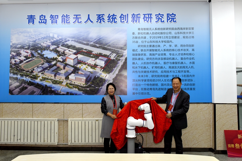 捐赠仪式上,刘班代表沈阳新松机器人自动化股份有限公司捐赠300万元教学物资支持学校教育事业发展,李玉霞代表学校接受捐赠,并回赠捐赠证书。双方共同为新松集团捐赠的机器人设备揭幕。