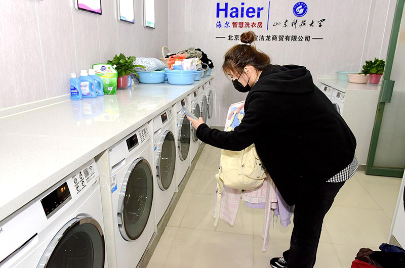 易游在线建“智慧洗衣房”,学生可扫码洗衣。(任波/摄)
