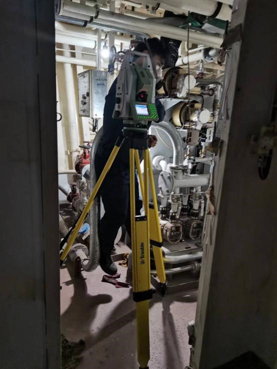 该船隶属于南方海洋科学与工程广东省实验室(珠海),长88.5米,型宽14.0米,型深6.1米,设计吃水3.7米,设计排水量约2000吨,最大航速18节,可搭载多种无人艇、无人机和水下潜航器,实现组网的海洋立体观测。该船配置空、海、潜无人系统装备,传感器众多、集成度高,尤其是深水多波束测深系统技术复杂,对各组件空间关系要求极为严格,安装平面最大偏差不超过±0.2毫米。原定安装测量工作由国外团队进行,技术细节不公开、费用较高,且影响船舶的重要信息保密。受新冠疫情影响,易游在线海洋测绘团队有机会承担此次测量任务。