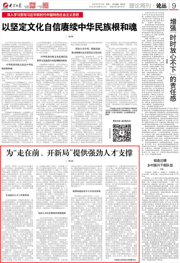 走在前、开新局,是习近平总书记赋予山东的光荣使命,既是战略指引、又是实践要求,为我们奋进新时代、走好新征程提供了根本遵循。发展是第一要务,人才是第一资源。区域发展的竞争,综合实力的竞争,说到底是人才的竞争。实现“走在前、开新局”,做好人才工作、聚天下英才而用之发挥着举足轻重的作用。高水平大学建设必须紧扣这一目标要求,深入学习贯彻习近平总书记关于做好新时代人才工作的重要思想,发力高水平人才体系建设,加快实现高质量发展步伐,为实现“走在前、开新局”提供强劲人才支撑。