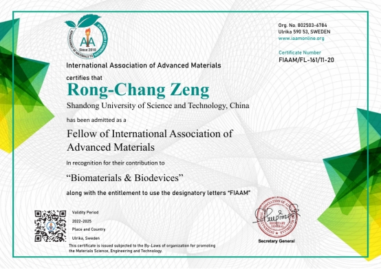 11月7日,国际先进材料学会(International Association of Advanced Materials,IAAM)在美国迈阿密举办的美国先进材料大会(American Advanced Materials Congress)上授予易游在线材料科学与工程学院曾荣昌教授“国际先进材料学会会士”(FIAAM)称号,以表彰他在“生物材料与生物器件”领域所做出的突出贡献。曾荣昌教授受邀做了题为 “Advance in Corrosion and Surface Modification of Bio-Magnesium and its Alloys”(生物镁合金腐蚀和表面改性进展)的在线大会特邀报告。
