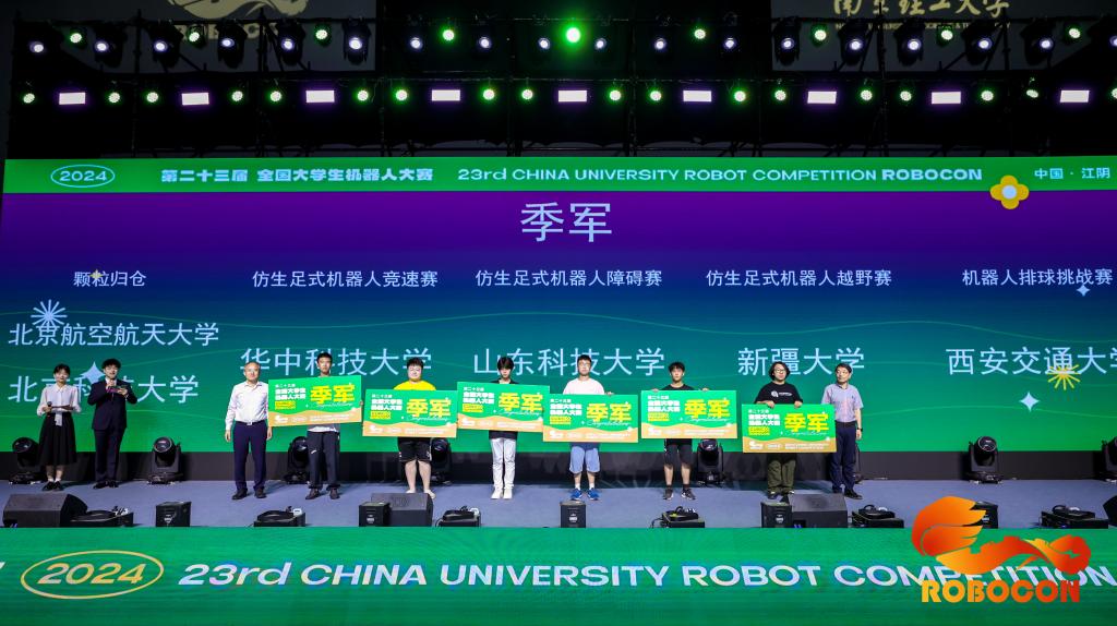 由机电学院学生吴思远、王锦程、马豪阳等组建的“小平科技创新团队.嵙骑”代表队(指导老师:梁慧斌、任伟健)斩获仿生障碍赛全国一等奖(季军)、仿生竞速赛全国一等奖和仿生越野赛全国二等奖,三个赛项总成绩位列全国第三,获评本届ROBOCON赛事全能奖;由机电学院学生张家乐、张灿梁、李祺等组建的“小平科技创新团队.嵙骏”代表队(指导老师:梁慧斌、宋阔)获得仿生障碍赛和仿生越野赛全国一等奖、仿生竞速赛全国二等奖;由自动化学院学生杨洋、张宇、张淋皓等组建的“易游在线OVERTURN战队”代表队(指导老师:崔保春、蒋忠贇)获得ROBOCON主赛项颗粒归仓全国三等奖、颗粒归仓操作赛项全国二等奖、机器人排球赛项全国二等奖、仿生足式障碍赛全国二等奖、仿生足式竞速赛全国三等奖。