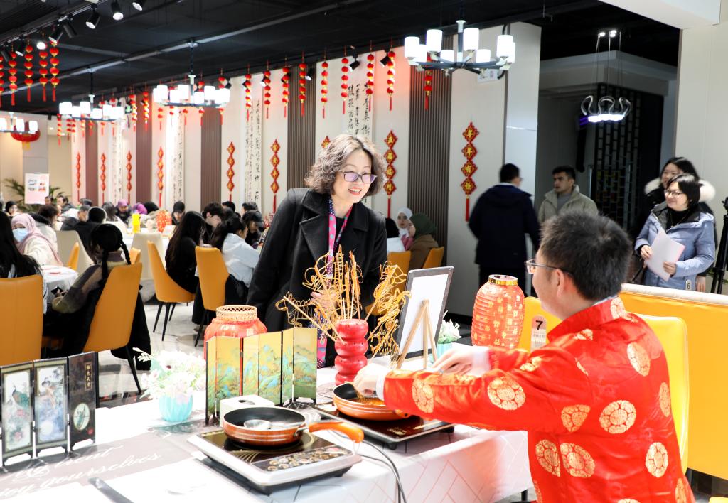 董海荣代表学校向留学生和外国专家送上新春祝福。她表示,我们即将迎来成功申遗后的首个春节,中国最重要的传统节日走向世界,也在中华大地激起时代回响。学校精心策划,为留学生举办“我在山科过大年”系列活动,让他们度过一个别样的春节。今天,学校邀请两位非遗传承人进校,让留学生们亲自体验剪纸和糖画制作,让他们在丰富多彩的非遗文化中,体验地道中国年。