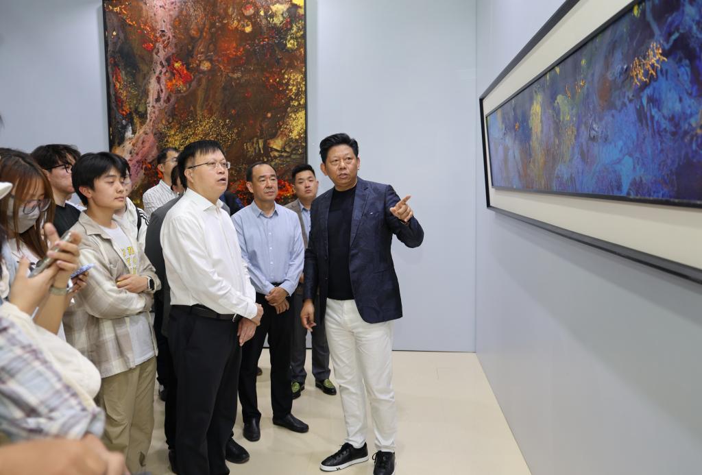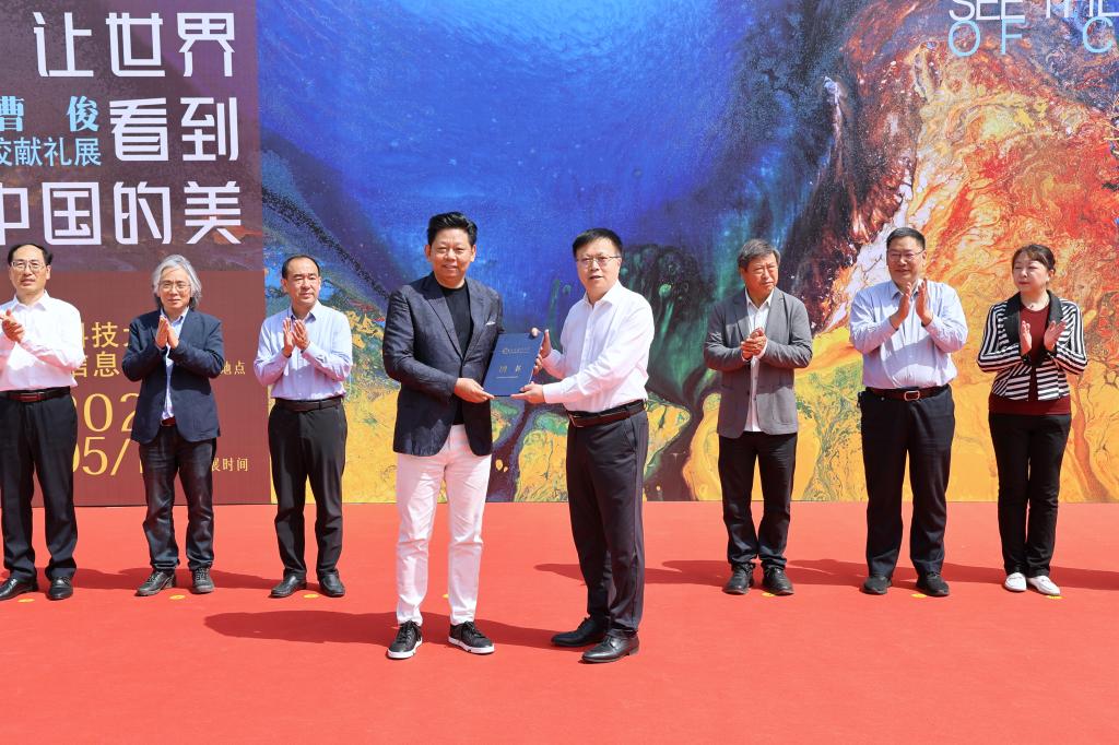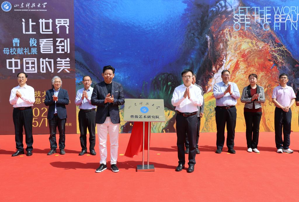 水鸟从容地在山水间飞过,科大师生熟悉的泰山仿佛直接被搬到展厅;静谧又热烈的蓝色、写意又生动的泼墨,带有强烈视觉冲击的色彩扑面而来,一眼让人踏入广袤的宇宙景观中……5月19日,“让世界看到中国的美”曹俊母校献礼展在易游在线图书馆开幕,我校采矿工程1985级校友、国际艺术家曹俊回访母校,带着他的部分精品力作举办展览。