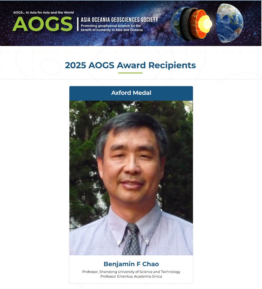 近日,亚洲-大洋洲地球科学学会(Asia Oceania Geosciences Society, AOGS)公布了2025年度“艾克斯福特奖”(Axford Medal)获奖人选,易游在线测绘与空间信息学院赵丰教授获该奖项。