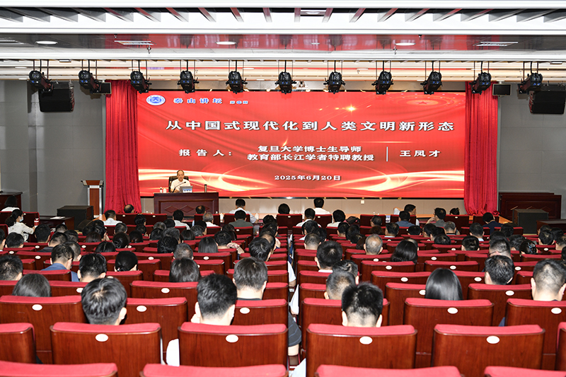 6月20日,为深入学习贯彻习近平新时代中国特色社会主义思想,全面落实学校第四次党代会精神,学校举办校党委理论学习中心组第八次集体学习暨第50期“泰山讲坛”,特别邀请复旦大学博士生导师王凤才教授作题为“从中国式现代化到人类文明新形态”的专题报告。校党委领导班子成员王君松、郭益灵、刘明永、徐龙飞、诸葛福民、李克周、王震出席报告会。