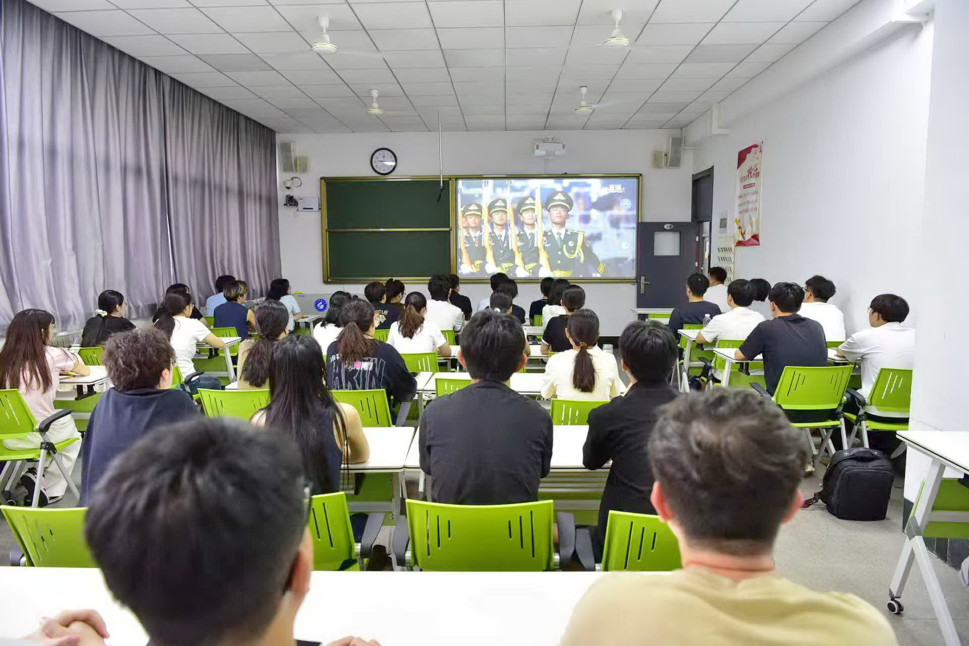在会议室、教室、报告厅、实验室等集中观看现场,广大师生员工全神贯注聚焦屏幕,观看阅兵式直播画面。受阅部队铿锵有力的步伐、现代化武器装备的亮相,引来会场阵阵赞叹声。