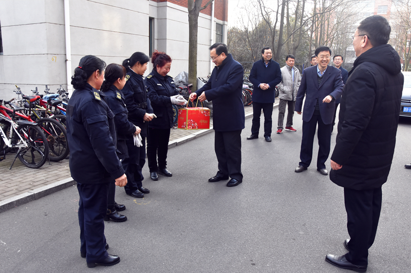 罗公利、张英杰一行先后来到办公楼值班室、南门值班室、教学楼值班室、网络与信息中心、学生公寓值班室、中心变电站、中心换热站、北门值班室、西北门值班室、学术交流中心、乡米香米餐厅、校医院、山海花园大门值班室、校园监控室等看望慰问在岗职工。每到一处,罗公利、张英杰等都热情地与值班人员一一握手,询问工作情况,并向他们表达节日的问候和新春的祝福,对他们为保证校园安全、让全校教职员工度过一个祥和幸福的春节而放弃节假日坚守工作岗位表示感谢,叮嘱他们要注意安全,安排好春节期间的工作和生活。