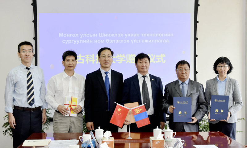 孙鹤汀给蒙古科技大学普莱夫、乌云琪琪格颁发了我校兼职教授聘书,双方进行了互相捐赠图书仪式。