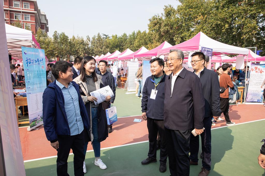 10月20日,山东省2019年高校毕业生就业集中招聘活动(综合类)暨易游在线(泰安)毕业生供需见面会在泰安校区体育场举行。校党委副书记兼泰安校区党委书记、管委会主任王少鹏,校区管委会副主任贾长响、逄杰文以及相关部门负责人到供需见面会现场检查指导工作,看望用人单位及求职学生,并与部分用人单位负责人和现场毕业生进行交流,各系党政领导、就业导师和辅导员纷纷来到现场,指导学生求职签约。