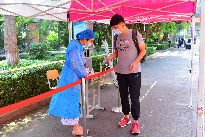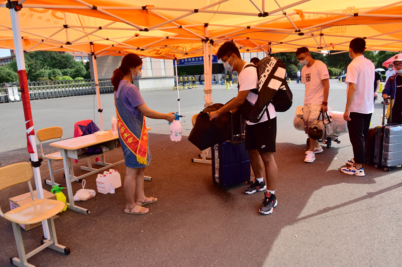 8月26日早上7点,青岛校区学校南门负责引导学生返校的学生志愿者、学工干部等工作人员已经到位。行李消毒、核验健康码、红外线测体温、人脸识别……按照事先安排好的流程,每个检验环节有条不紊,返校学生有序报到。