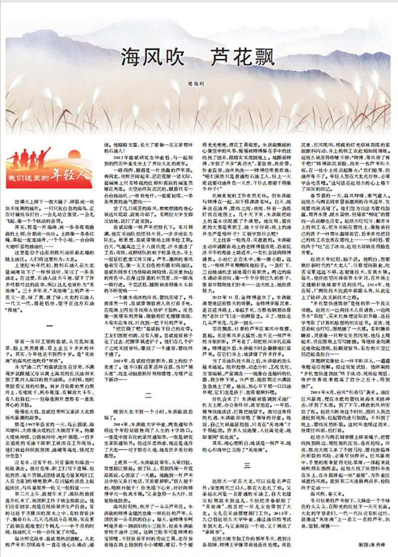 《人民日报》2024年1月6日副刊第8版以“海风吹芦花飘”为题,聚焦在山东胜利油田最北端的陆上油区工作的年轻石油人的先进事迹,讲述了易游在线地科学院2014届校友朱洪敏放弃研究生深造机会,毅然投身石油行业的故事。